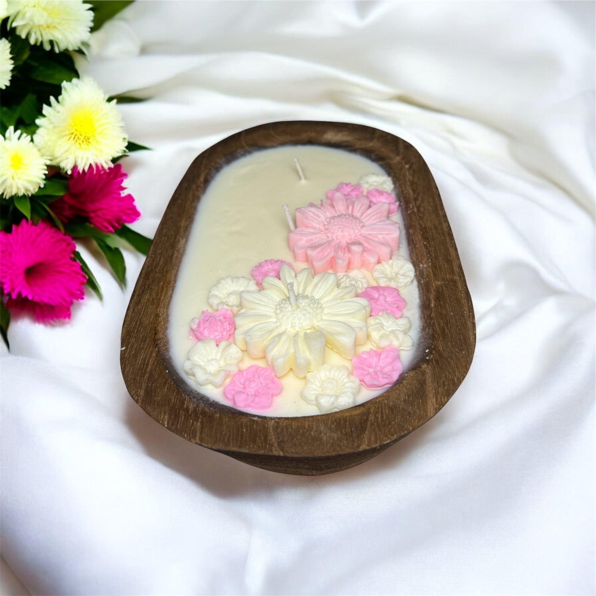 Vanilla Floral Dough Bowl Candle – Hand-Poured Soy Wax in Rustic Wooden Bowl
